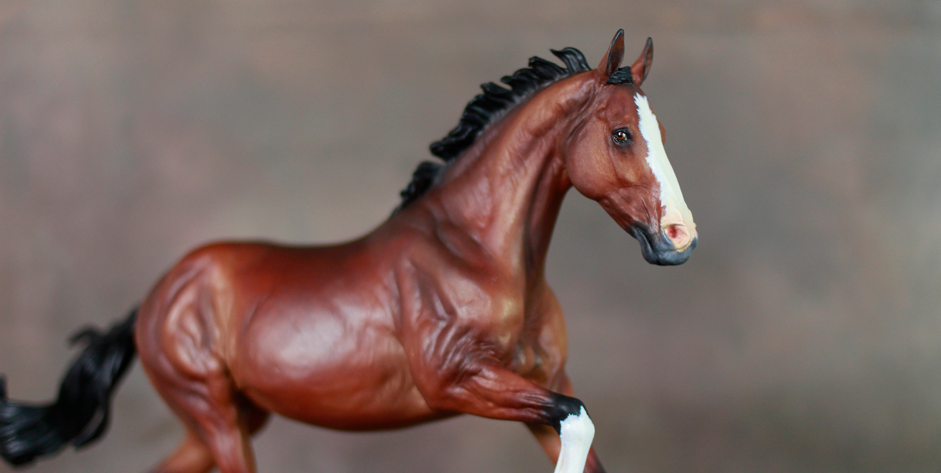 The outstanding Anise painted to a glowing mahogany bay, with chrome! She is sure to catch any onlooker's eye on the cross country course, powering her way through the terrain, ears perked, and loving every minute. Posed with pure athletisicm, those powerful legs can conquer any obstacle that comes in her path, and with four blazing white stockings, touched with bits of light pink at her ankles, those legs are sure to make the majesty of her performance even more magical.