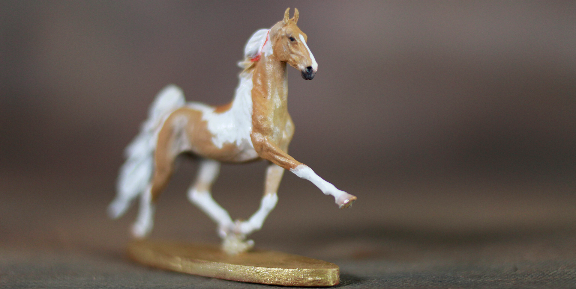 This micro Covergirl has all the trimmings for such a tiny lady. Red ribbon, soft pink nose, metallic hooves...oh my! She is painted in mostly oils, while her white's are in acrylic. Her base is painted in metallic gold and it just really makes her pop!