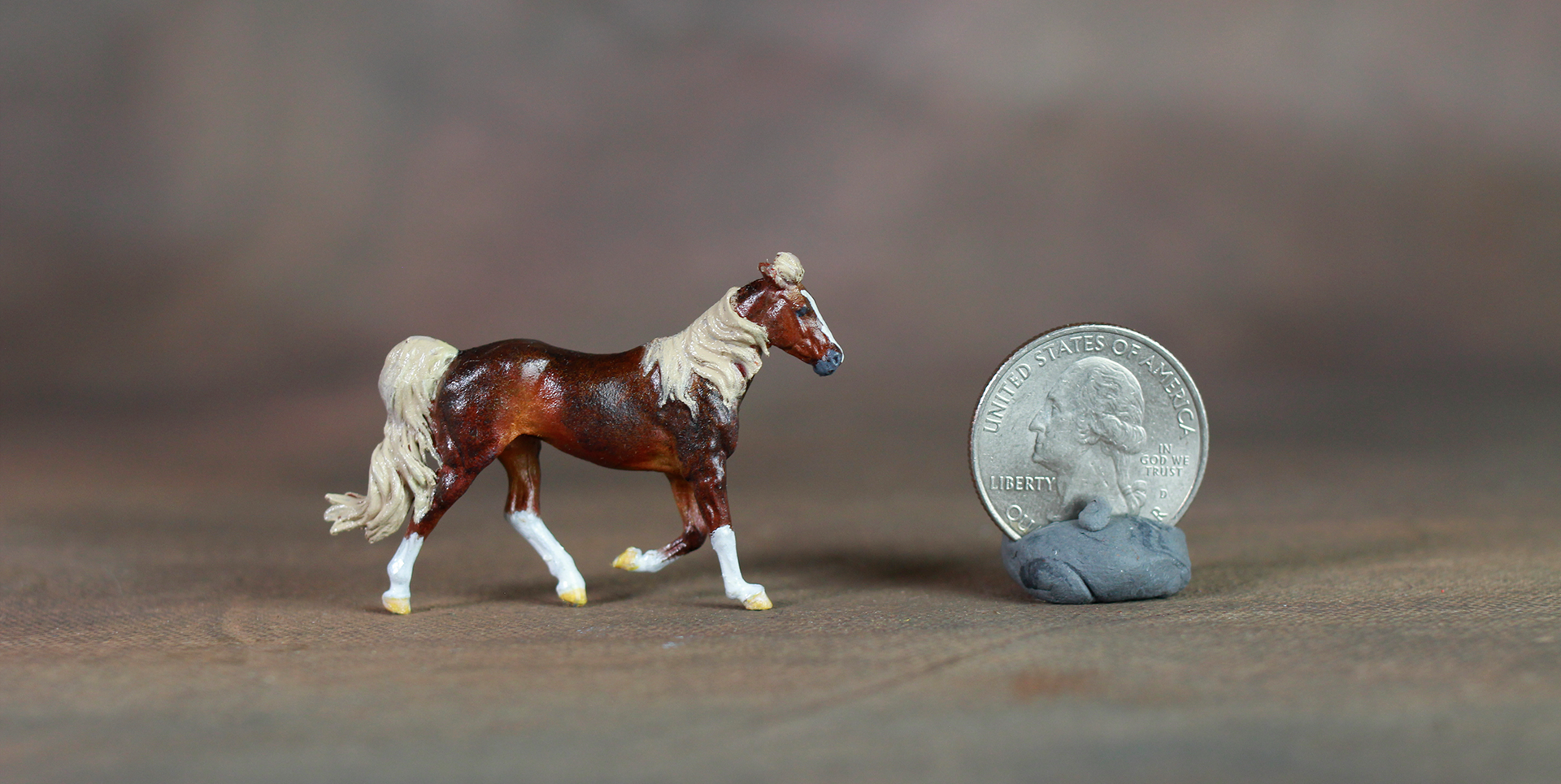 Now here is a healthy and glowing liver chestnut! This one is the queen of the barn and just loves to make an entrance. Featherstep has been painted to a dark liver chestnut with four white socks, complete with handsome facial markings. She has been sealed in a semi-gloss high quality sealant to give her that extra glow! Featherstep is a pewter micro created by Maggie Bennett painted in oils.