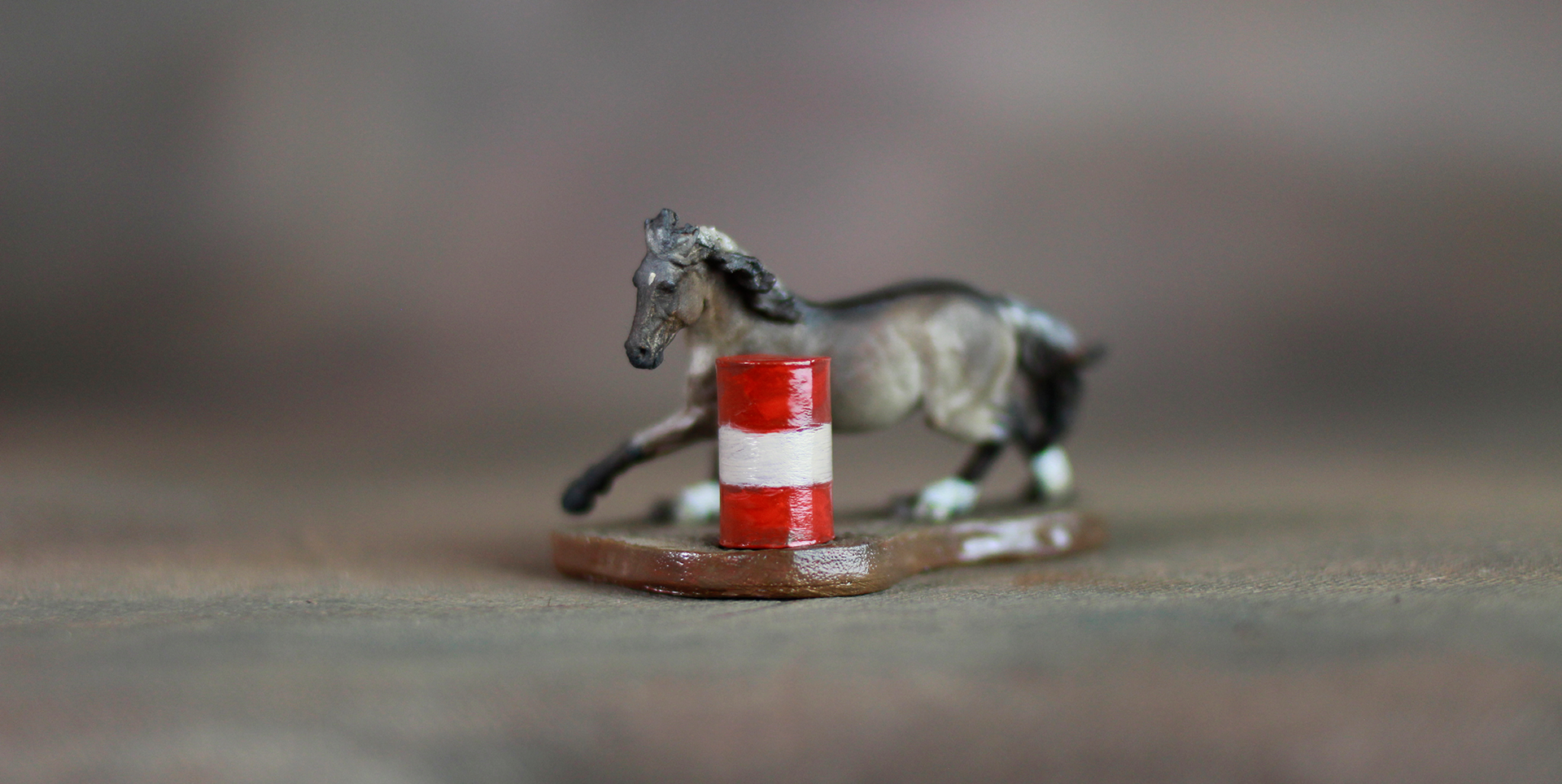 Blazing around that tight turn is the magnificent horse with her flying multi-colored mane and tail! Maple Stirrup is a true grulla complete with dorsal stripe, three white socks with striped hooves to boot, and a little star atop her dark colored face. Maple Stirrup is a pewter micro created by Maggie Bennett and is painted in oils and has been sealed in a high quality final sealant.