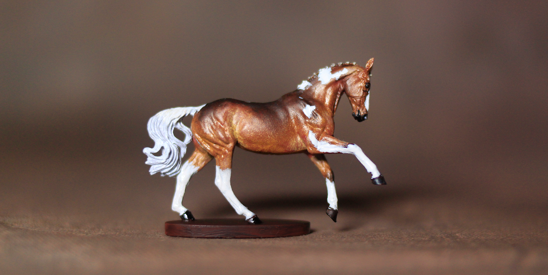 This micro Mielzela has all the trimmings for such a tiny lady. Deep chestnut coloring, soft pink nose, and petite dark hooves for the arena. She is painted entireley in oils and has been finished with a high quality final sealant for durability.