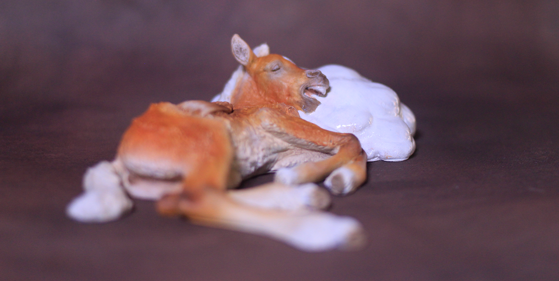 Ozzie has all the trimmings with with soft fades of lighter and darker coloring. He is a handsome blonde chestnut with gray muzzle, and petite pale brown hooves. He hasn't quite grown into his socks yet but who knows how many he will have, but for now he has soft light coloring around his feathers. He is painted entireley in oils and has been finished with a high quality final sealant for durability.