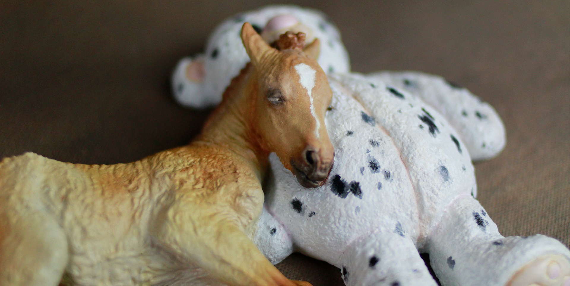Dreaming of wide open spaces in his sleep this little guy is DunBenTuckeredOut. A beautiful golden peach dun, with...what's this?! An appaloosa spotted bear? This is no ordinary foal indeed! He is indeed destined for great things. His little star on his forhead comes to a tiny crooked stripe all the way to the tip of his soft muzzle and one sweet little white sock appears on his left right hind. DunBenTuckeredOut also sports a strong dorsal stipe down his little back, and he and his spotted bear are painted entirely in oils, and the sweet teddy has high gloss varnish eyes, one brown and one blue!
